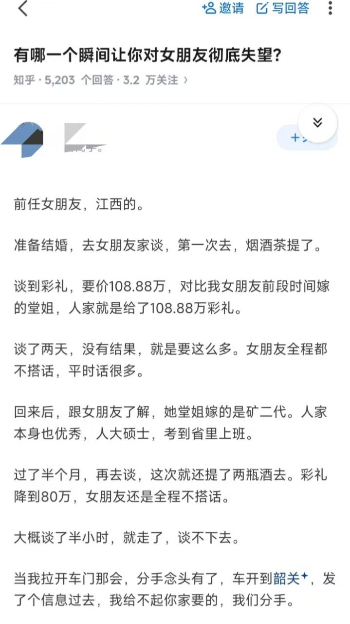 还有一种典型且屡见不鲜的场景是,女方自己就在主动索要高额彩礼,甚至自己的父母都浑然不知。著名的杭州38岁网红女硕士欧阳薇薇在万松书院要求88万彩礼,尽管她在批评声中逐渐降低了价格。一位浙大法学女硕士生给自己男友开了一份不平等的婚前协议,其中的主要内容都是彩礼,包括一辆二十多万的新能源汽车。我的一位朋友曾经有一位女友,她要求他在杭州购置一套婚房(而当时正是杭州房价的最高峰),他短时间内难以筹措到资金,于是他们分手了。